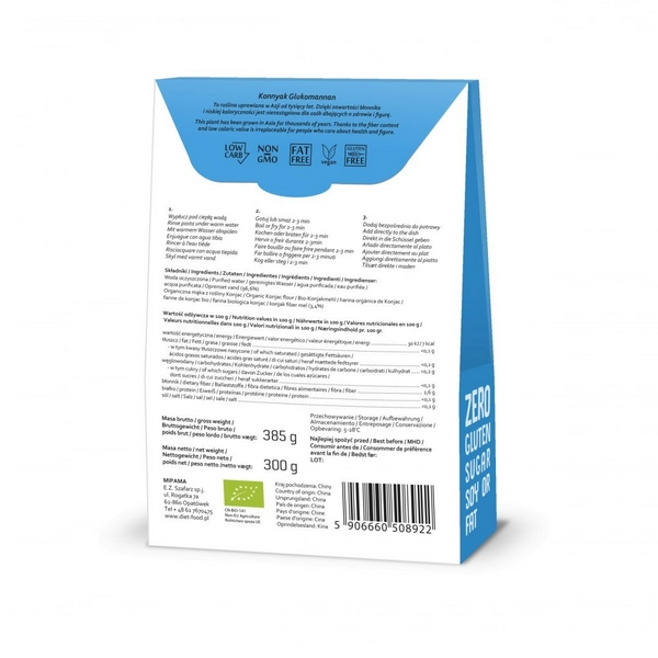 Comment consommer les pâtes Bio Shirataki Konjac ? Rincez soigneusement les pâtes sous l’eau courante tiède. Faire bouillir ou frire pendant 2-3 minutes. Ajouter directement au plat. Conserver dans un endroit sec et frais. Après ouverture, conserver au réfrigérateur dans la saumure, bien fermé, maximum 3 jours.