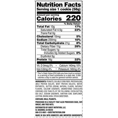 Le cookie protéiné Quest Nutrition est le substitut parfait pour satisfaire vos envies de sucre. Un cookie procure 15g de protéines de qualité afin de fournir à votre corps les neuf acides aminés essentiels dont il a besoin. Quest Nutrition veille à utiliser des recettes personnalisées pour créer leurs propres croustilles au chocolat, morceaux de biscuits et autres inclusions afin de rendre chaque bouchée aussi délicieuse que vos envies. Ce cookie, certifié KETO, apporte une bonne dose de protéines et ne contient pas de sucres ajoutés. Quest Nutrition a pour mission de faire en sorte que les aliments dont vous avez envie agissent pour vous et non contre vous.